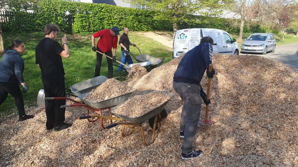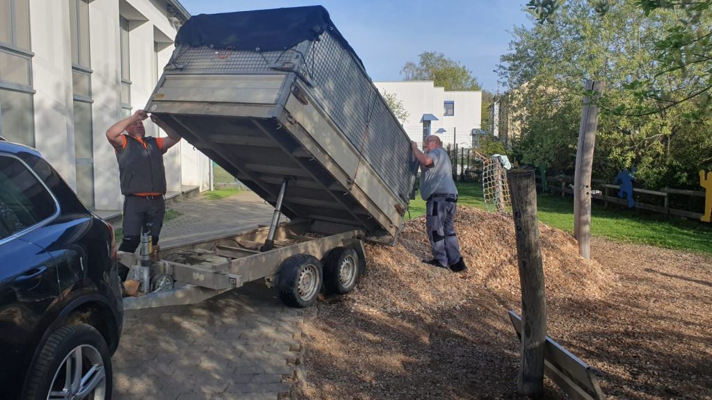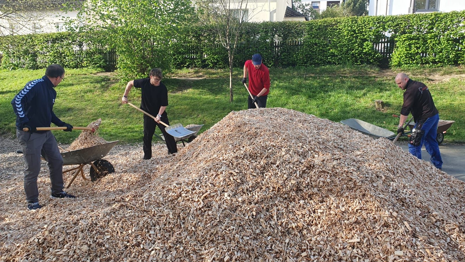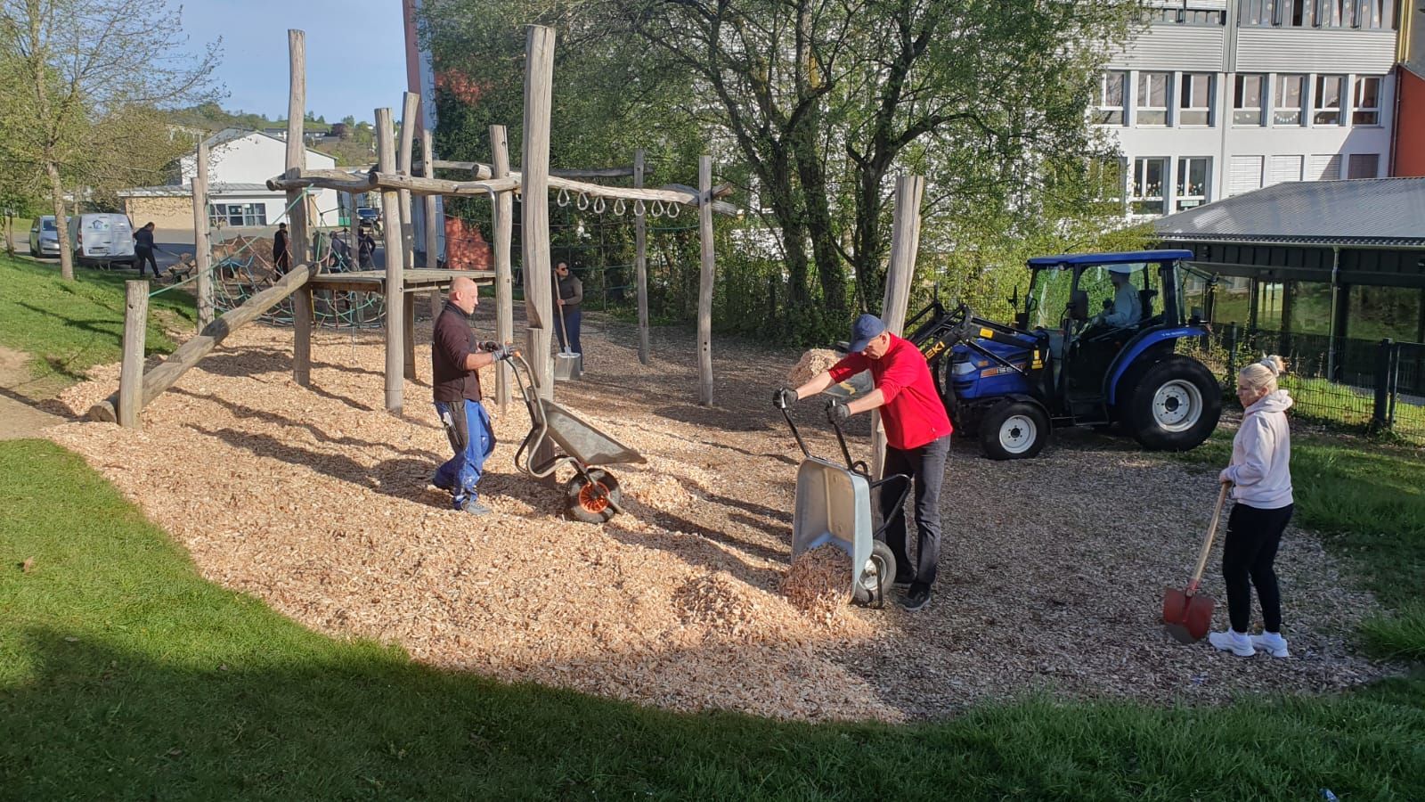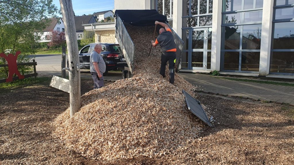 Mit tatkräftiger Unterstützung aus unserer Elternschaft konnten die Hackschnitzel, die in den frühen Morgenstunden geliefert wurden, heute sogleich verteilt werden, so dass die Kinder in der großen Pause endlich wieder ihr Klettergerüst erobern konnten.
