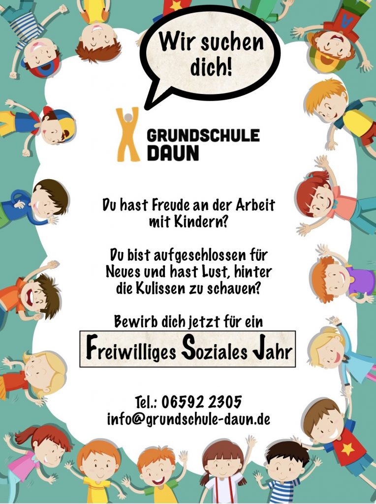 Interesse am Freiwilligen Sozialen Jahr an der Grundschule Daun? Dann melde dich für ein unverbindliches Gespräch bei uns, oder bewerbe dich direkt beim Kulturbüro RLP, unserem Kooperationspartner.