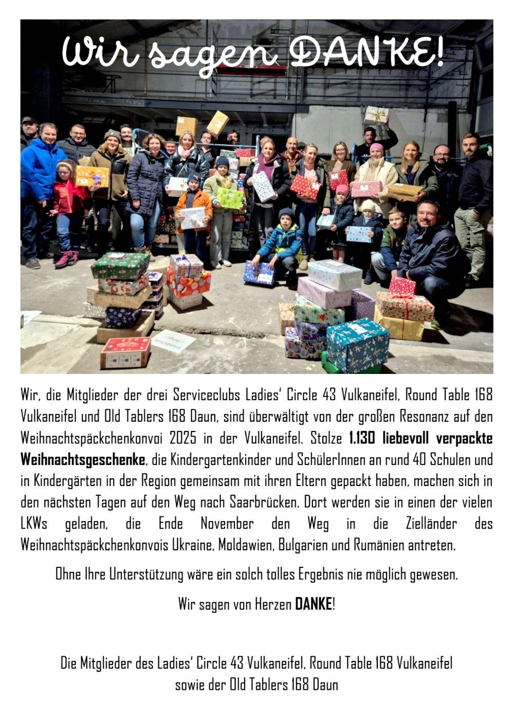 Der Weihnachtspäckchenkonvoi bringt seit vielen Jahren Freude zu Kindern in Rumänien, Moldawien, Bulgarien und in die Ukraine. Für viele von ihnen ist es das einzige Weihnachtsgeschenk, das sie erhalten. Im vergangenen Jahr konnten allein aus der Vulkaneifel 1.129 liebevoll gepackte Geschenke auf die Reise gehen.